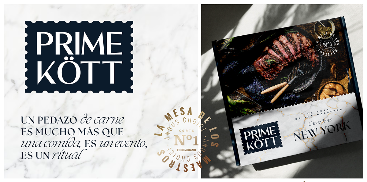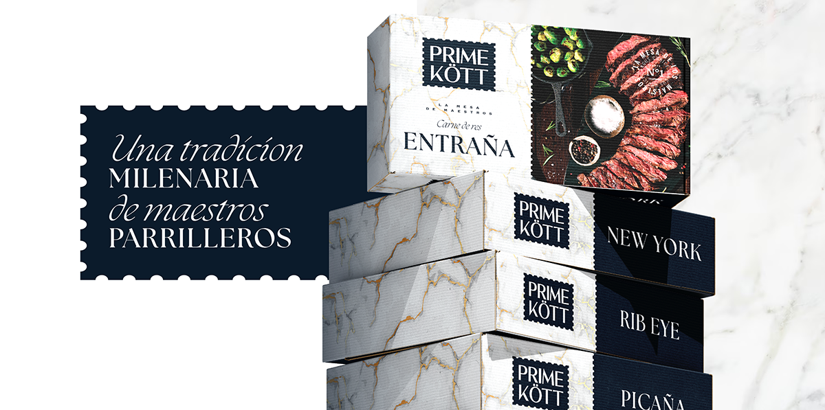 Создан бренд Prime Kött для известной говядины, которая долгие годы продавалась без бренда в сети Olímpica благодаря своему высокому качеству. Название Prime Kött объединяет международное качество и современность — «Kött» означает «мясо» на шведском, а «Prime» подчеркивает высшее качество. Упаковка с темно-синими и мраморными текстурами, а также изысканная типографика придают продукту элегантность и авторитет. Круглые мотивы, как «La Mesa de los Maestros», символизируют встречи и обмен опытом. Prime Kött — это не только успешная частная марка, но и пример преобразования выдающегося продукта через дизайн.